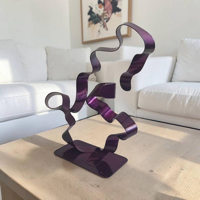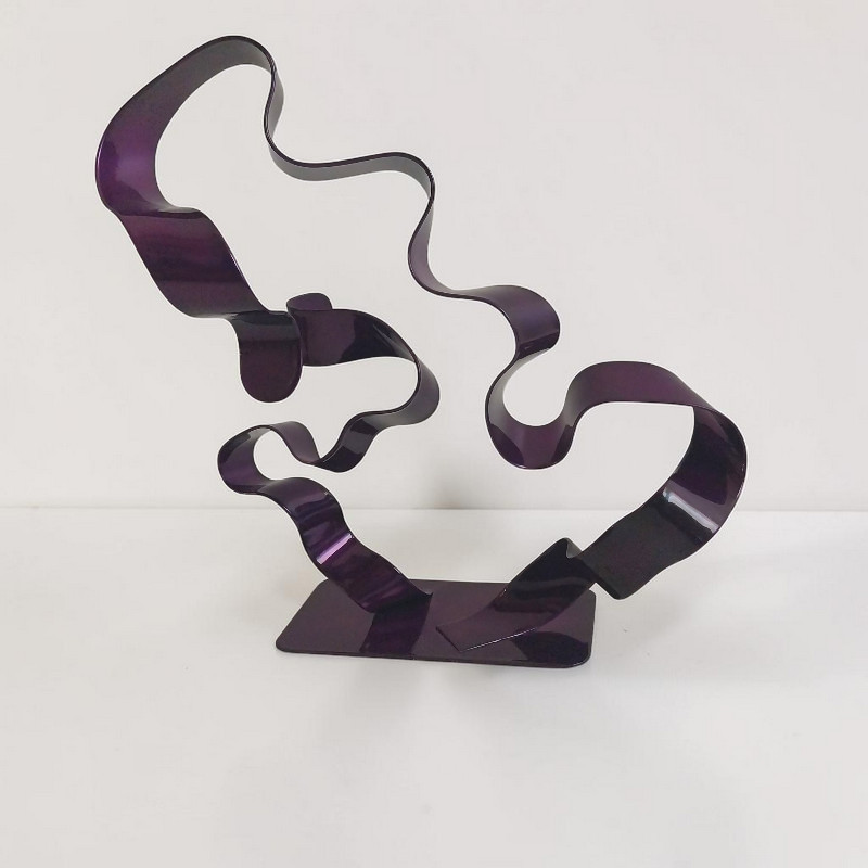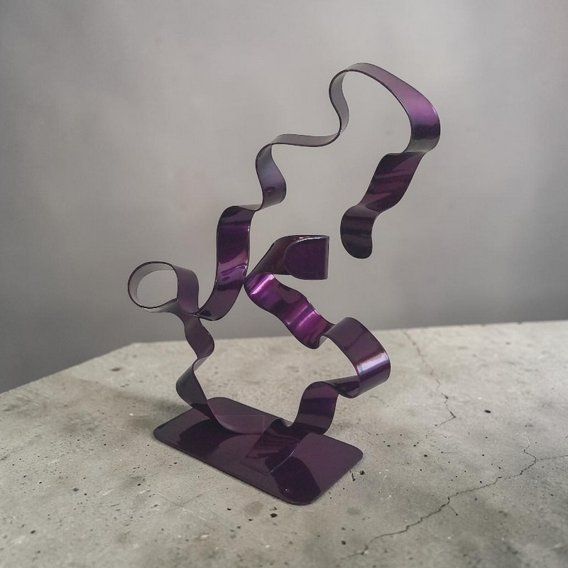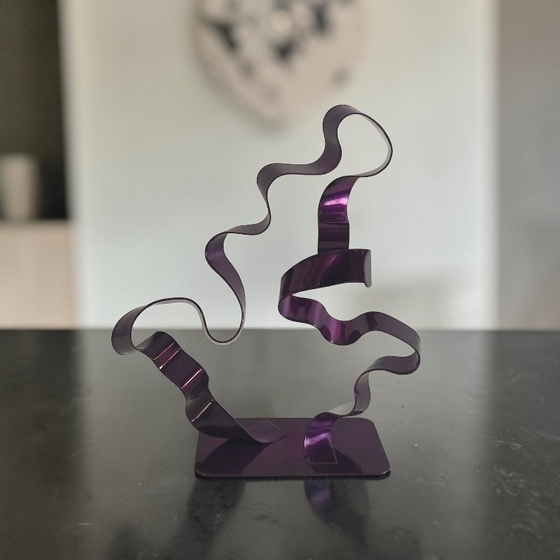 Sculpture métal abstraite torsadée violet à double lame, réalisée à la main à partir de deux bandes d’acier. Une pièce unique au design moderne et contemporain.