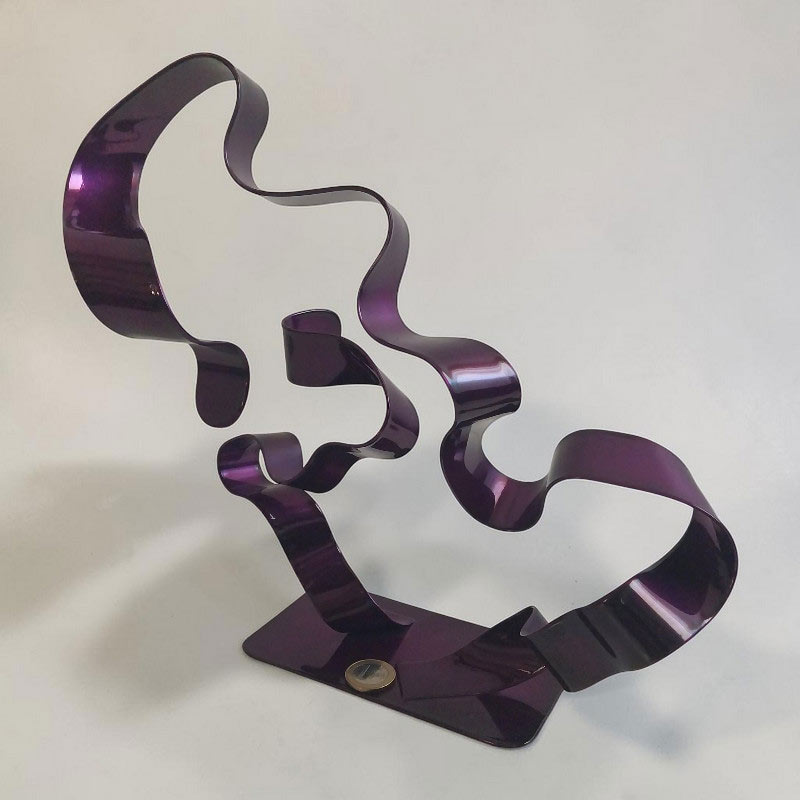 Cette sculpture abstraite en métal torsadé violet est réalisée à la main à partir de deux bandes d’acier mises en forme dans mon atelier.