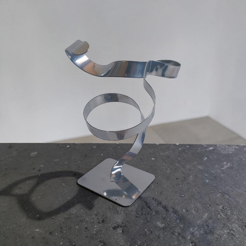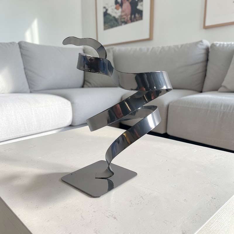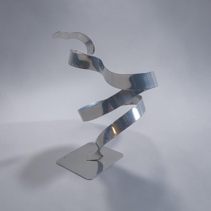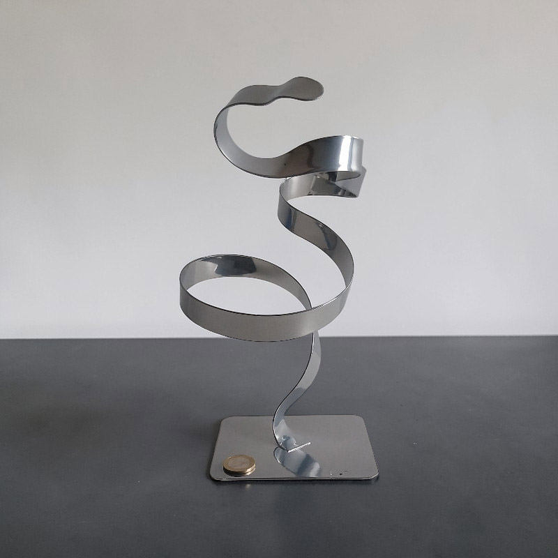Cette sculpture abstraite en métal torsadé chrome est réalisée à la main dans mon atelier à partir d’une lame de métal façonnée et mise en forme.