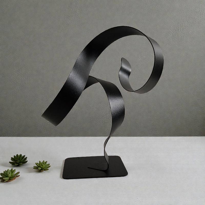 Cette sculpture abstraite en métal torsadé noire pailleté est réalisée à la main dans mon atelier à partir d’une lame de métal façonnée et mise en forme.